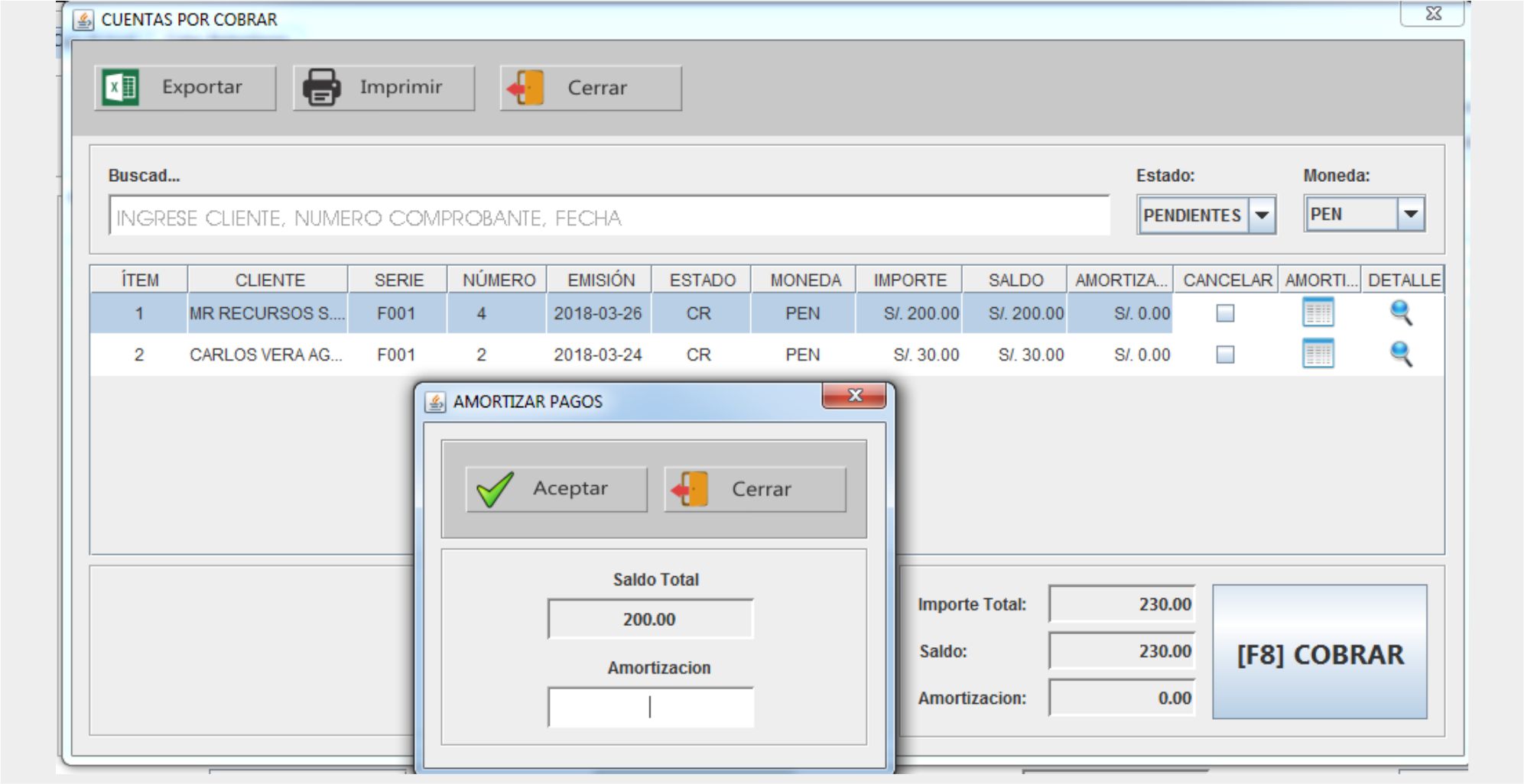 En cuentas por cobrar, vamos a poder realizar búsquedas rápidas por nombre del cliente, por número de comprobante y por fecha; Luego de seleccionar el documento que queremos cancelar o amortizar se procederá a consignar el importe que será cancelado, el cual será grabado.