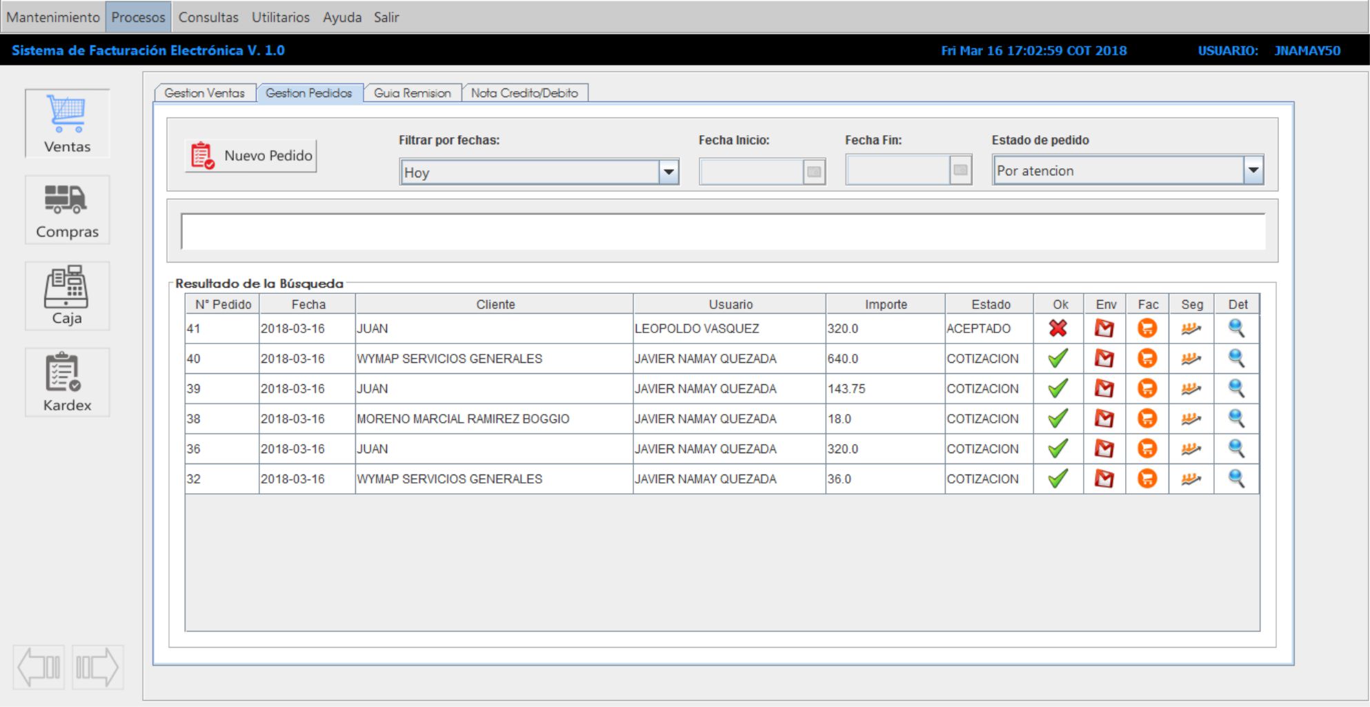 En este módulo también podemos utilizar filtros rápidos ingresando el número de pedido, el nombre del cliente o razón social y nos muestra el detalle del pedido y el seguimiento o gestión realizada por el vendedor.