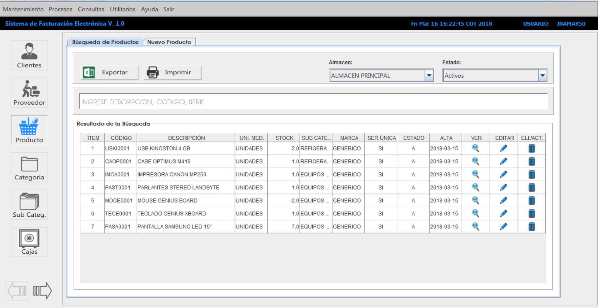 La información que brinda el sistema, es de gran utilidad para cuando tenemos que realizar el cuadre de los inventarios, por tal razón el sistema nos facilita el acceso para poder exportar la información al Excel, imprimirla o enviarla por correo. La información de los productos la podemos listar utilizando los filtros diseñados en el sistema o mediante el buscador inteligente.